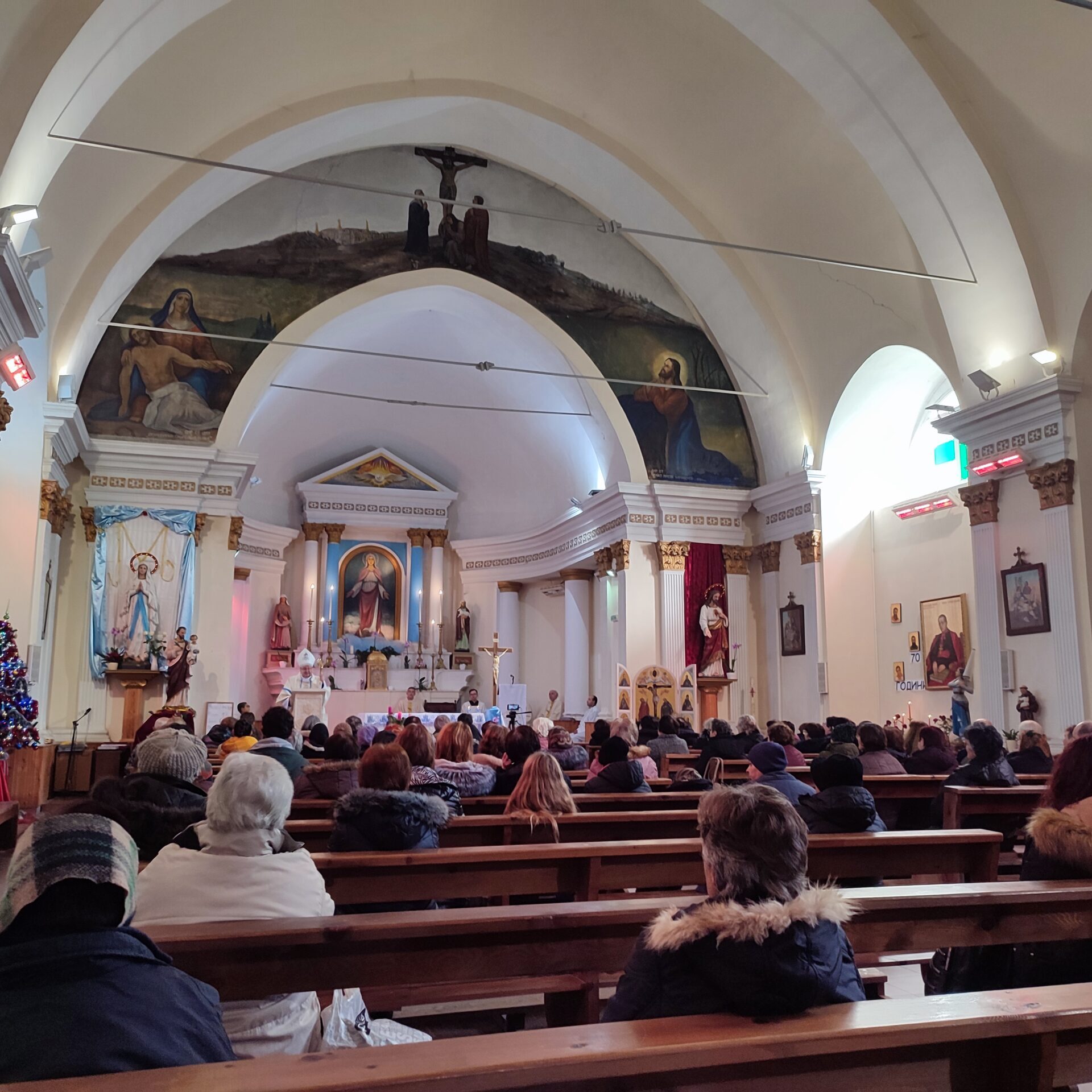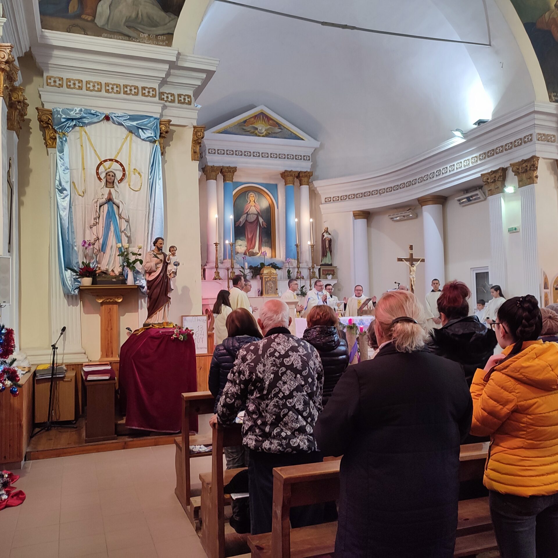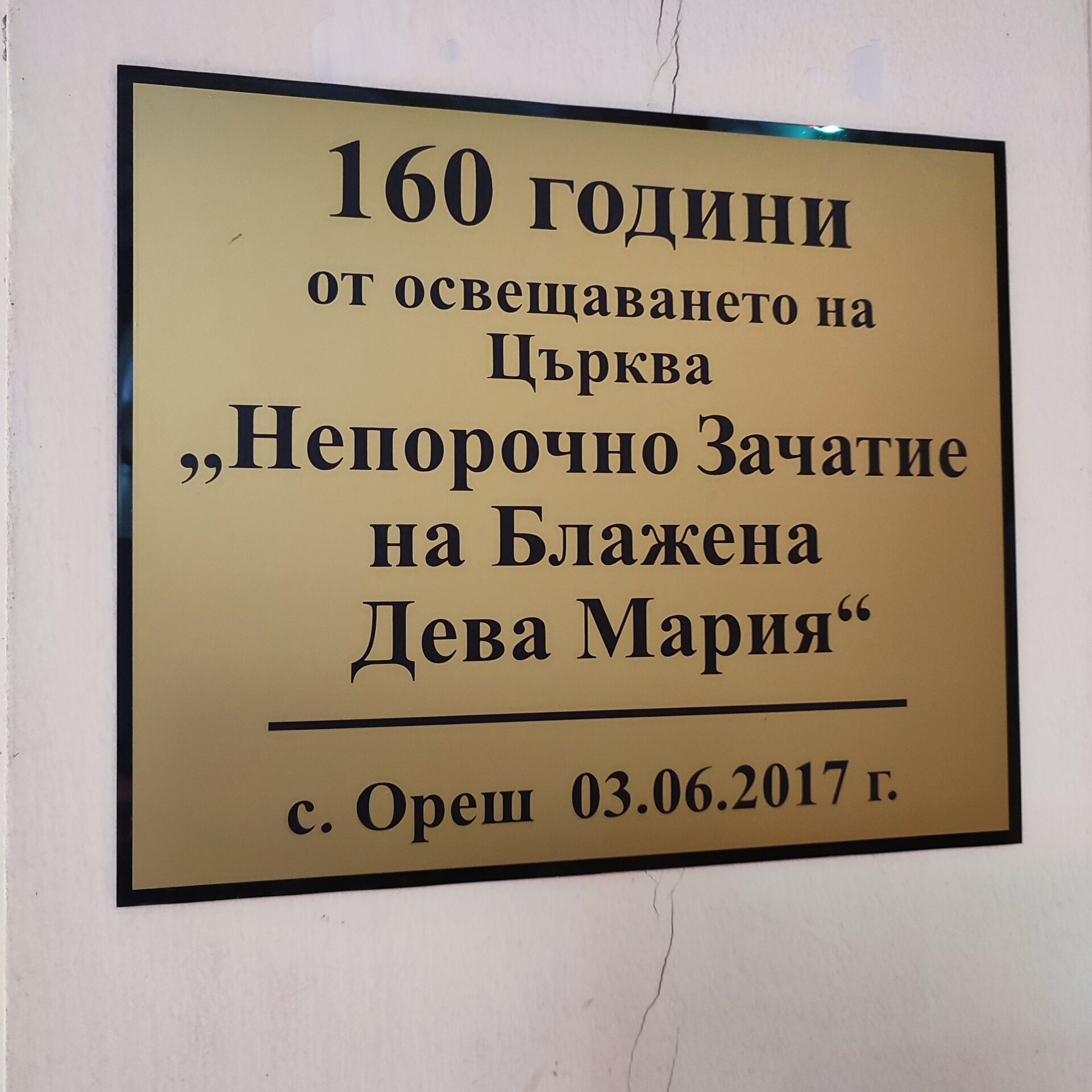 За вечен спомен. – В годината на поправеното спасение 1851, ден 25 февруари, биде основана тази черква в чест на Всемогъщия Бог и на Блажена Дева Мария без грях зачената, на мястото на старата разрушена, от Светлий и Високопросвещений Господин Ангел, Граф де Парси, Никополски Епископ, Администратор на двете Влахии, Епископ Присъствен на Папски Престол, Къщен Прелат на Негово Светейшество Пий IX Велик Първосвещеник притежател на Турския Орден за Заслуга наречен “Нишанъ Иптакаръ” – и за разстоянието на пет години градена и на Празника Петдесятница, 31 Май 1857г. чрез тържествено осветение повърната на божествена служба.