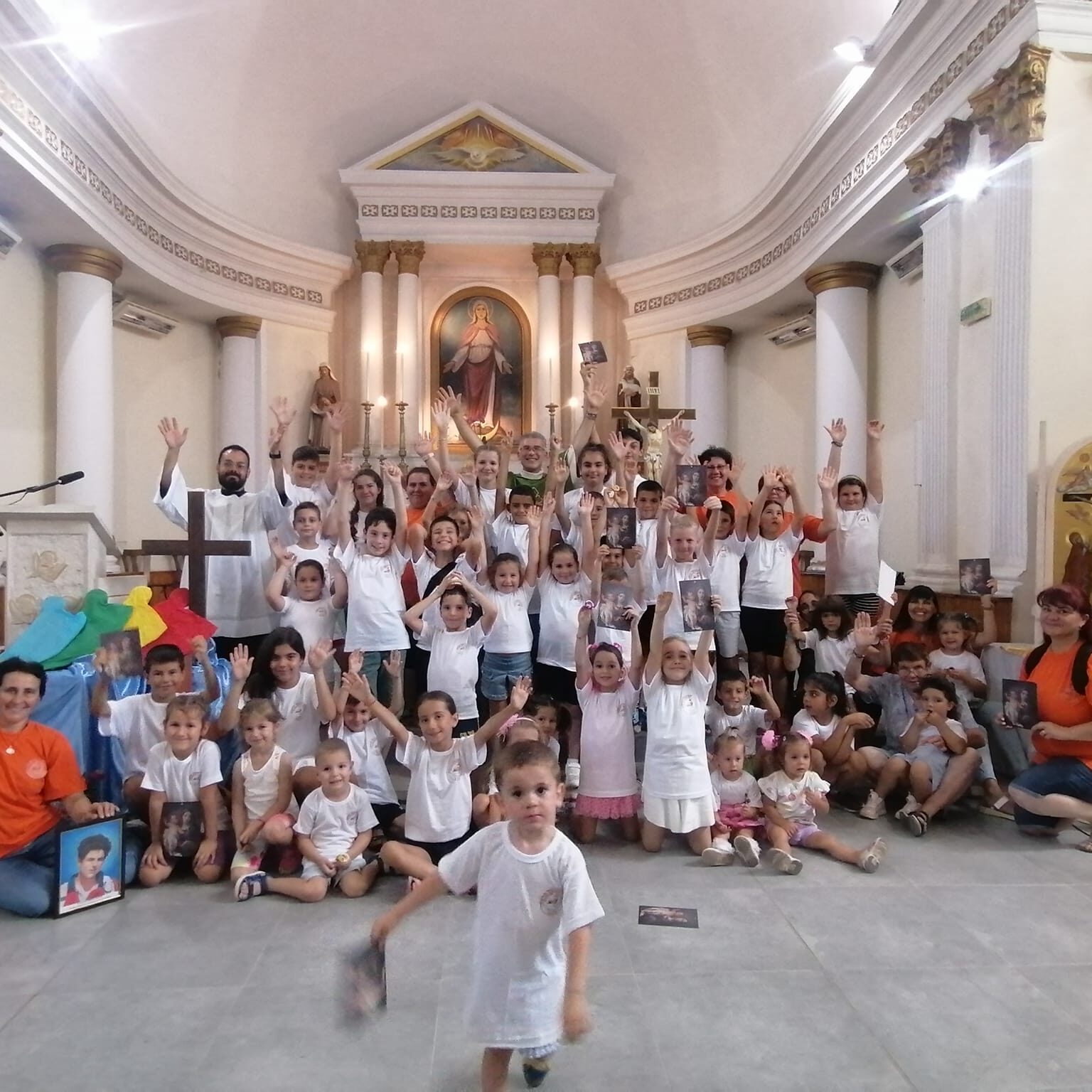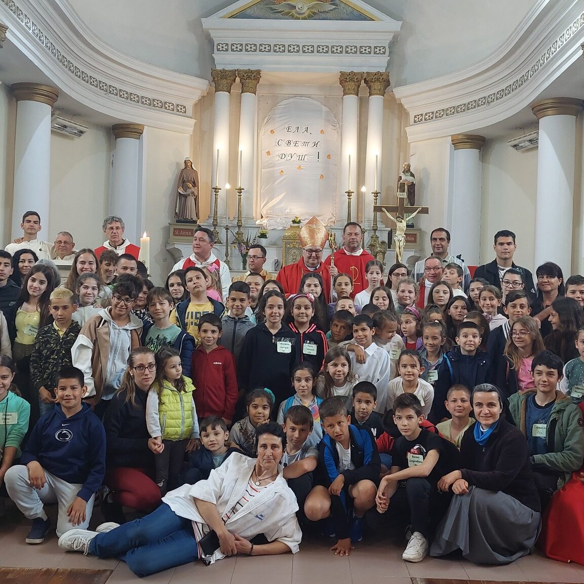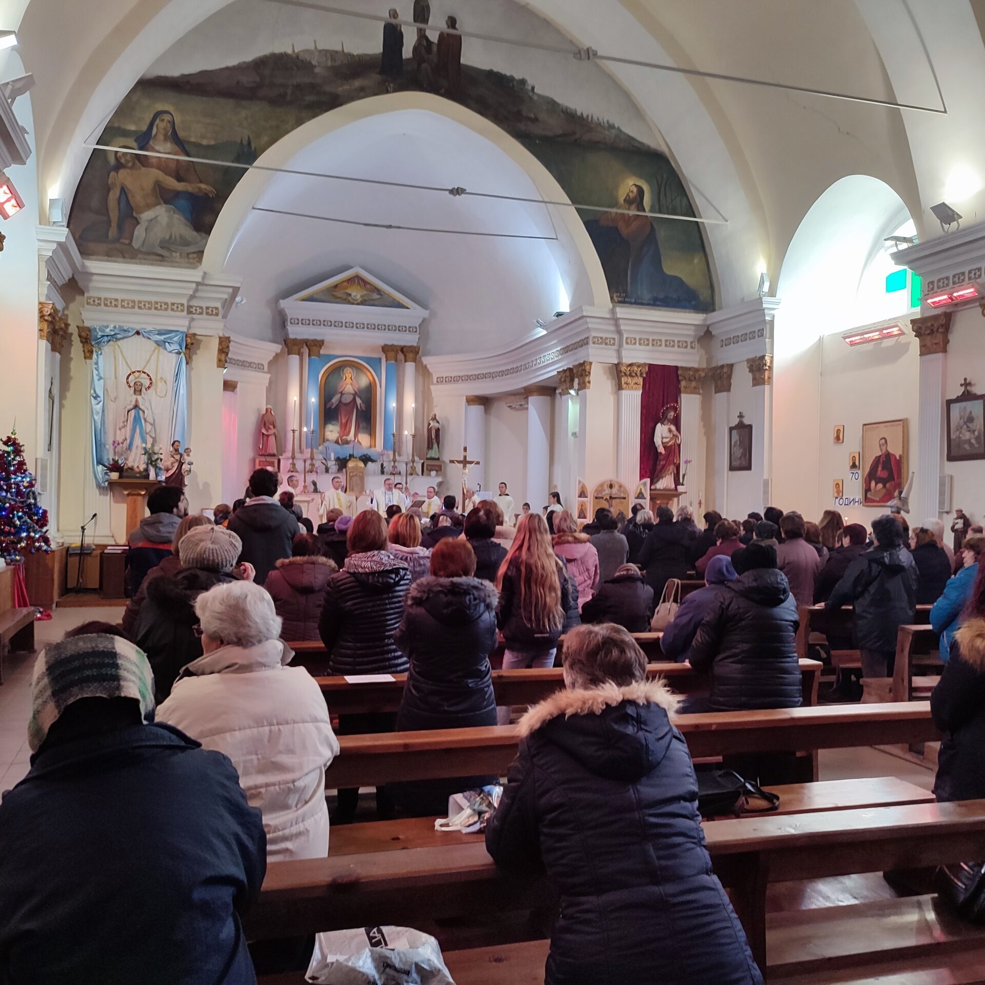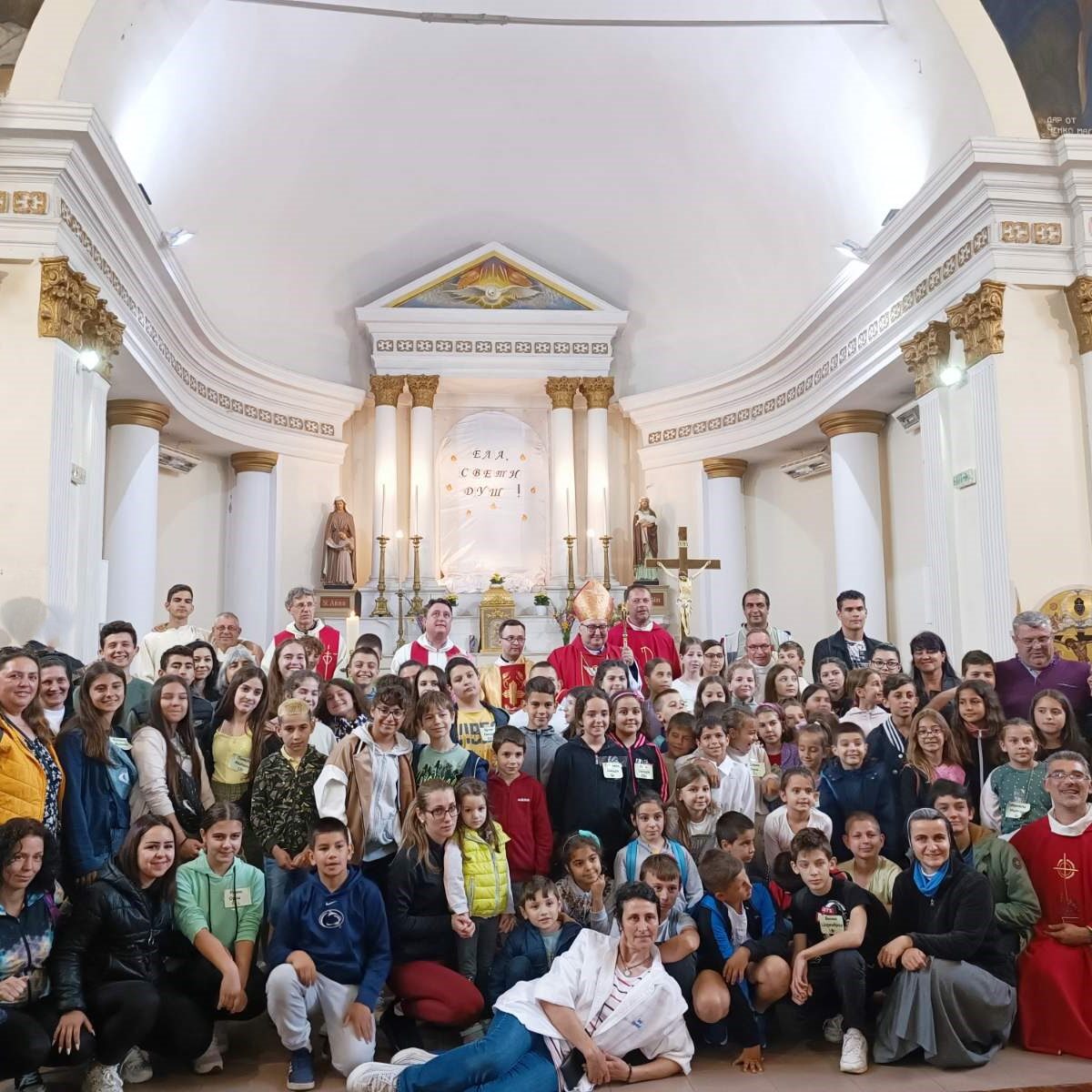 За вечен спомен. – В годината на поправеното спасение 1851, ден 25 февруари, биде основана тази черква в чест на Всемогъщия Бог и на Блажена Дева Мария без грях зачената, на мястото на старата разрушена, от Светлий и Високопросвещений Господин Ангел, Граф де Парси, Никополски Епископ, Администратор на двете Влахии, Епископ Присъствен на Папски Престол, Къщен Прелат на Негово Светейшество Пий IX Велик Първосвещеник притежател на Турския Орден за Заслуга наречен “Нишанъ Иптакаръ” – и за разстоянието на пет години градена и на Празника Петдесятница, 31 Май 1857г. чрез тържествено осветение повърната на божествена служба.